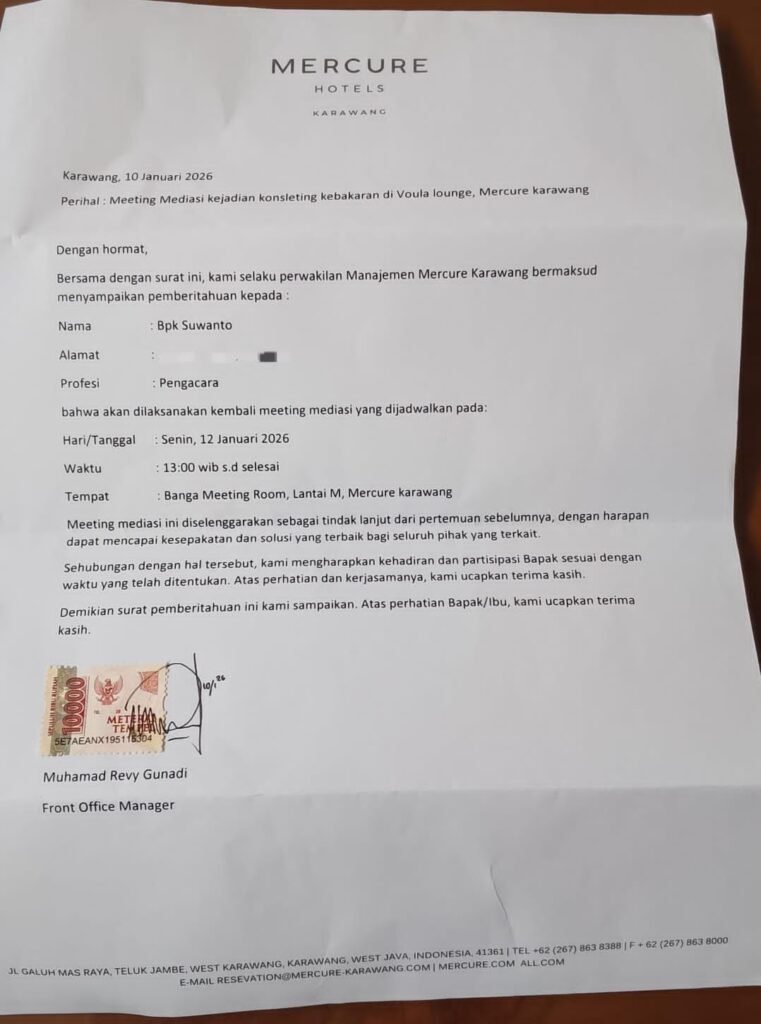 Karawang, 12 Januari 2026 – Pihak Hotel Mercure Karawang diduga memberikan informasi palsu dan diduga tidak memberikan bantuan apapun ketika alarm kebakaran berbunyi dan aroma asap muncul di kamar tamu hingga sepanjang tangga Darurat, Keluarga korban, yang diwakili oleh Sy Suwanto SH ( WAKIL KETUA UMU FERADI WPI ) dan didampingi tim Hukum dari Organisasi Advokat FERADI WPI, dimana Ketua Umum FERADI WPI menunjuk Waketum DPP FERADI WPI REVAN PRATAMA WIJAYA SH ( Ketua Tim ), DAUD JR SITUMORANG SH, PELIPUS KUWAY SH untuk mengawal Perkara ini hingga tuntas agar Korban Yaitu Sy Suwanto SH dan keluarga mendapat keadilan, kini dalam kondisi stabil setelah mendapatkan penanganan medis.