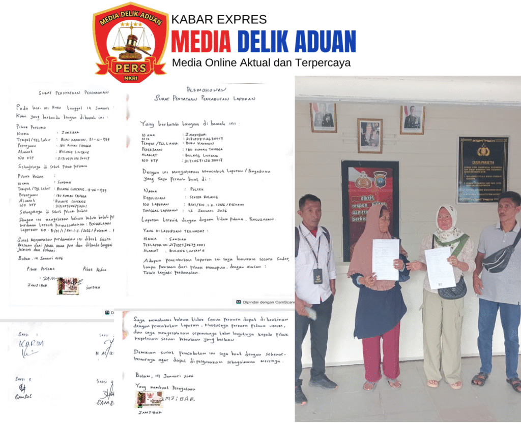 www.delik-aduan.com | Batam, 14 Januari 2026 — Dugaan tindak pidana penggelapan bantuan sosial yang sempat viral dan dilaporkan ke Polsek Sektor Bulang akhirnya berakhir damai. Pelapor, Zamzibar, secara resmi mencabut laporan terhadap terlapor, Sandiah.