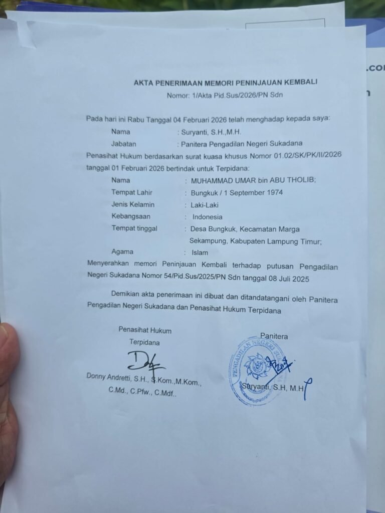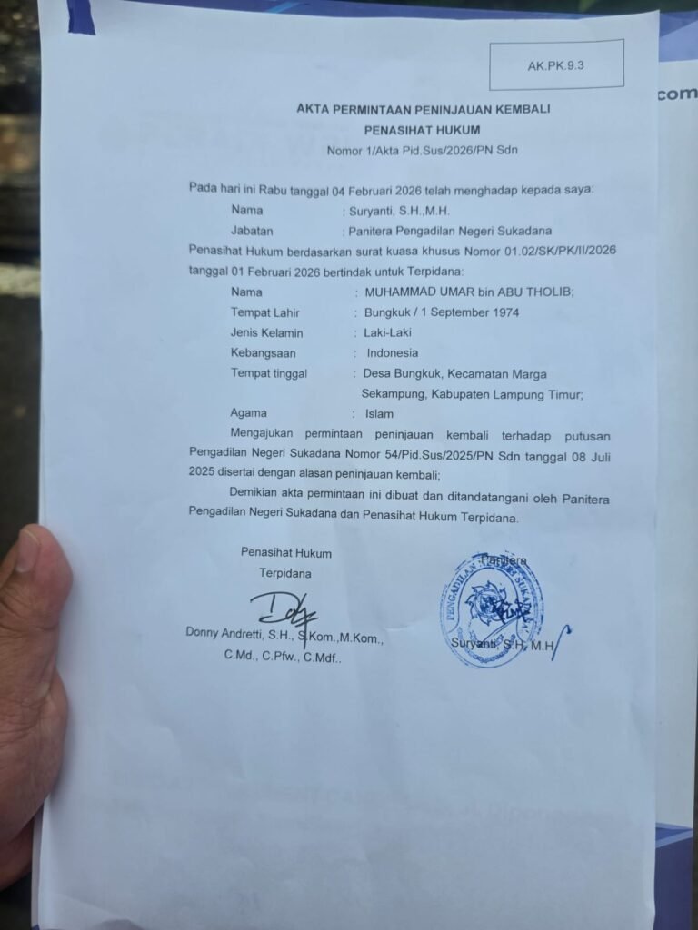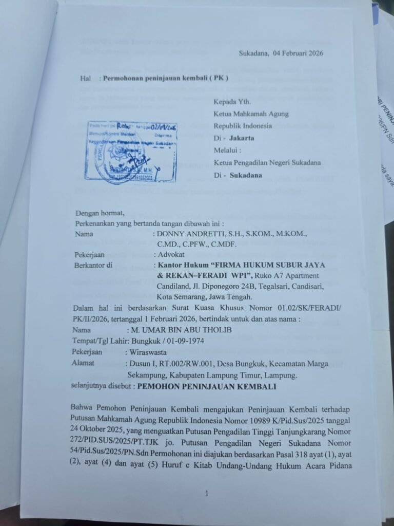Lampung Timur — Tim kuasa hukum dari Subur Jaya Lawfirm – FERADI WPI secara resmi mengajukan upaya hukum luar biasa Peninjauan Kembali (PK) atas nama terpidana M. Umar Bin Abu Tholib ke Mahkamah Agung Republik Indonesia melalui Pengadilan Negeri Sukadana, Lampung Timur, Rabu (4/2/2026).