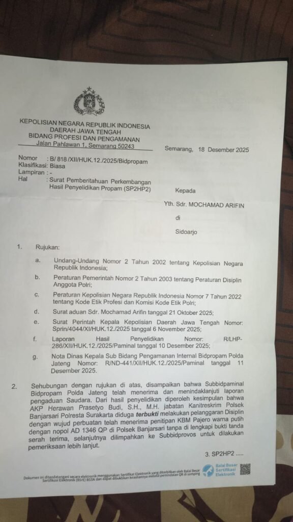 Surakarta, 28 Desember 2025, Jawa Tengah — Perkembangan terbaru kasus dugaan perampasan kendaraan Mitsubishi Pajero Sport Dakar Warna Putih dengan Nomor Polisi AD 1346 QP STNK atas nama Umi Munawaroh di Surakarta mulai memperlihatkan adanya kepastian hukum bagi korban. Bidpropam Polda Jawa Tengah menerbitkan Surat Pemberitahuan Perkembangan Hasil Penyelidikan (SP2HP2) tertanggal 18 Desember 2025, yang menyimpulkan adanya dugaan pelanggaran disiplin oleh oknum aparat dalam proses penitipan kendaraan saat peristiwa berlangsung. Dan diduga TERBUKTI unsur pelanggarannya.
