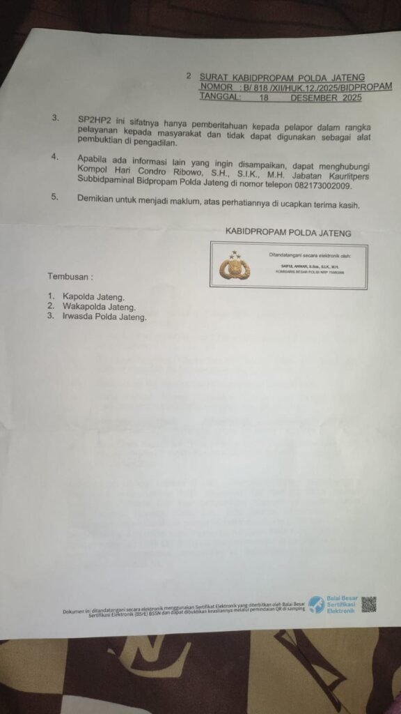 Surat ini ditandatangani secara elektronik oleh Kombes Pol Saiful Anwar, S.IK., S.I.K., M.H., NRP 79060090, selaku Kabidpropam Polda Jateng, serta ditembuskan kepada Kapolda Jawa Tengah, Wakapolda Jawa Tengah, dan Irwasda Polda Jawa Tengah.